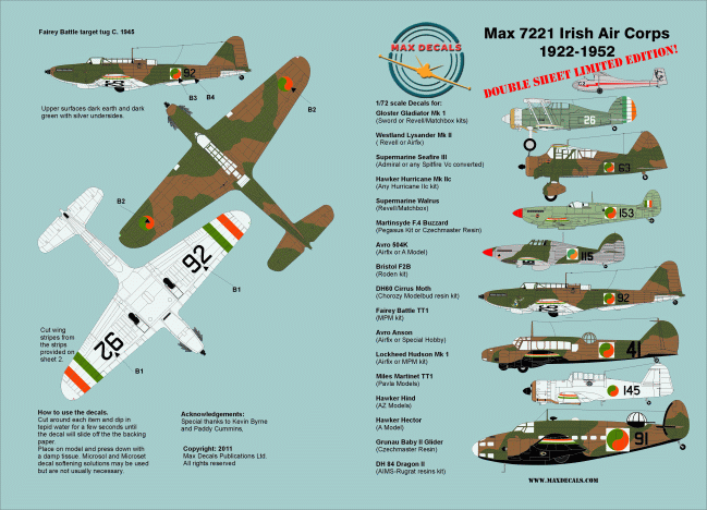 Max7221 Irish Air Corps 1922-52 1/72 scale decal sheet instructions